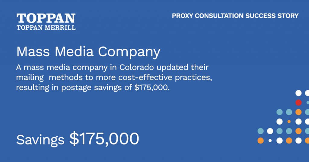 By modernizing your annual meeting communications with Toppan Merrill, you can reduce risk, improve efficiency and deliver a better shareholder experience. Learn more about our proxy solutions and explore additional insights in our blog on navigating the annual proxy season.
